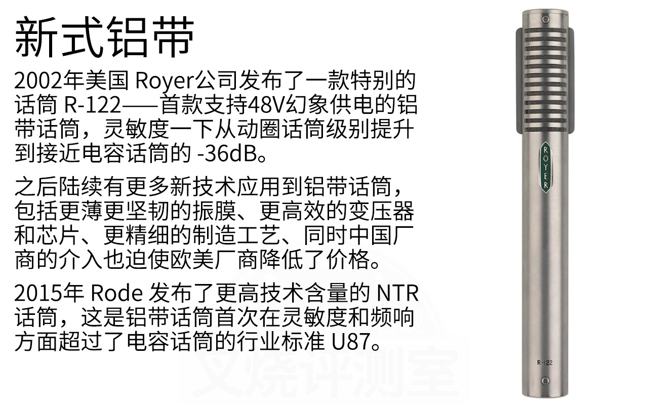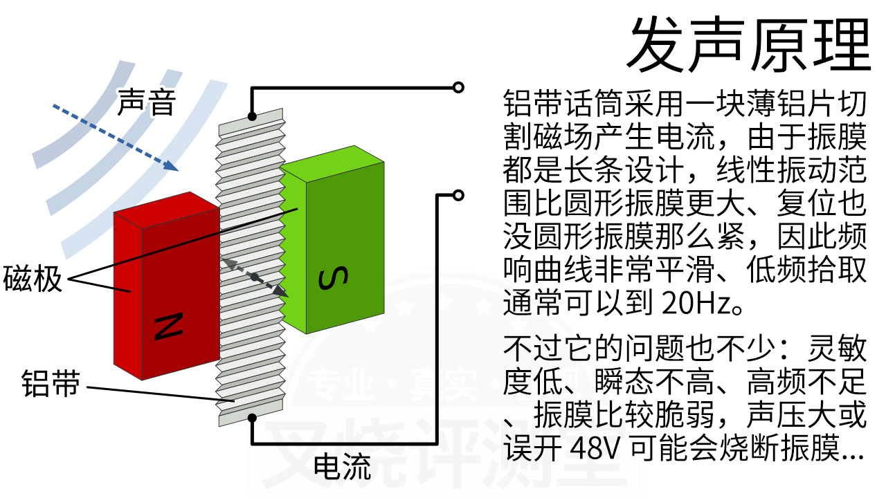 它与电容话筒都是上世纪30年代兴起的技术,欧洲人民偏好电容话筒,美国人民偏好铝带话筒,形成了一种行业习惯直到今天,可谓美国的 “国民话筒”。声音特点是肥暖(低频出色)、衔接平滑、瞬态较慢、高频偏少,简而言之是 “舒服、不刺激”,轻爵士和慢歌御用,有时也用于替代动圈话筒录制大声压(例如吉他箱)或高频太亮(例如小号)的乐器。