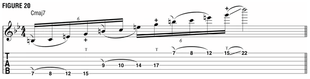 如果你不反感左手大跨度演奏,那这条是一种很便捷的方式来演奏大七和弦琶音。把 Cmaj7 琶音(C E G B)放在一根弦上,然后跨弦提高八度再重复演奏一遍。