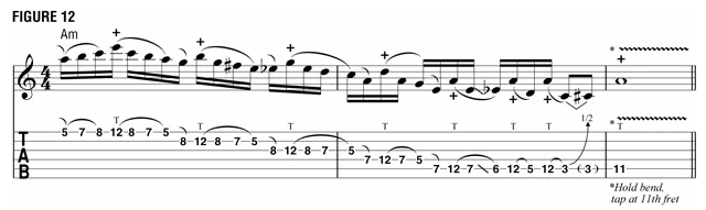 乐句一开始是 Paul Gilbert 式的跨弦乐句,然后开始大段点弦加上滑音。除了第2小节中的C,此乐句的音符都来自于Gm7琶音(G Bf D F)。