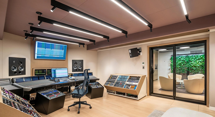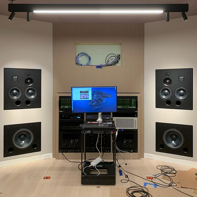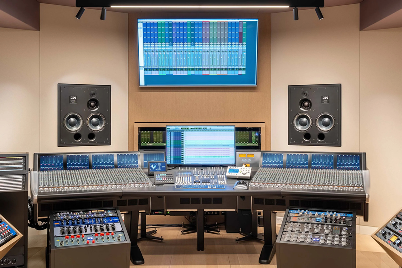 录音棚的主控室核心是一对定制安装的 ATC SCM110ASL 三分频有源监听音箱,加两只SCM0.1-15超低频音箱,组成的2.2立体声监听系统。