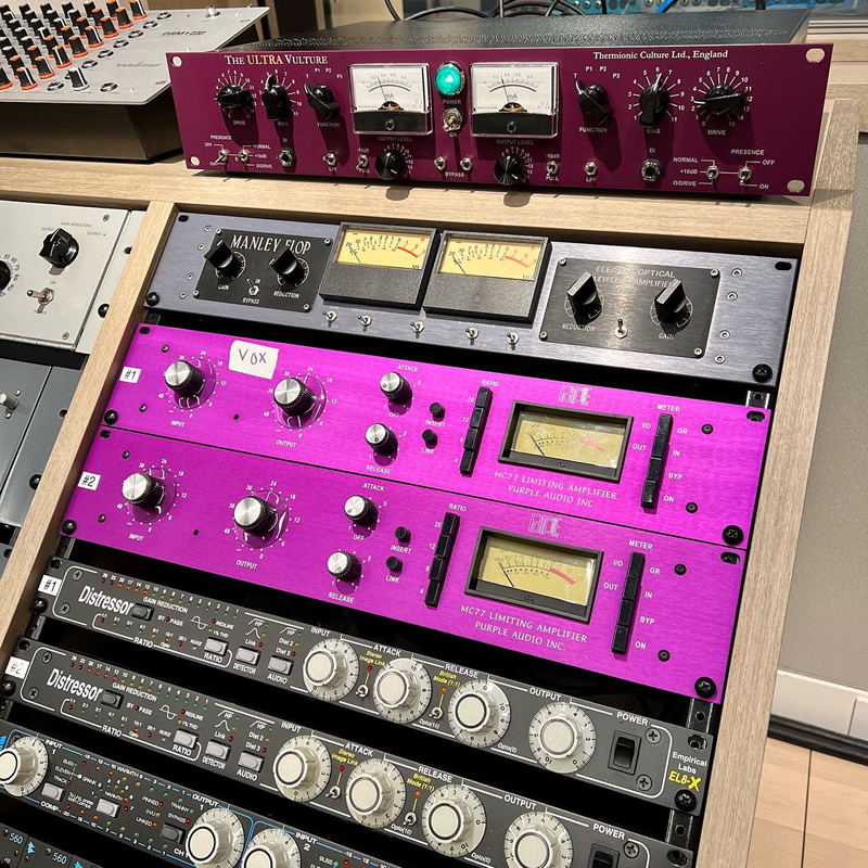硬件机架上2台紫色的设备,格外引人关注。来自Purple Audio的MC77,作为早期复刻1176的产品MC76的继任者,其表现广受好评。