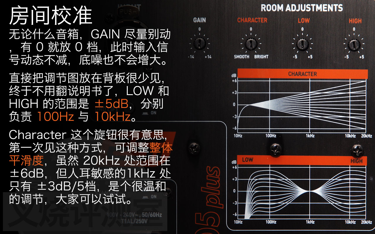 衔接:默认设置下 1kHz ~ 5kHz 比较突出,我们做轻微调整:LOW +1dB、Character -1dB,频响就比较平直了,确实 Character 旋钮使声音更加平滑。