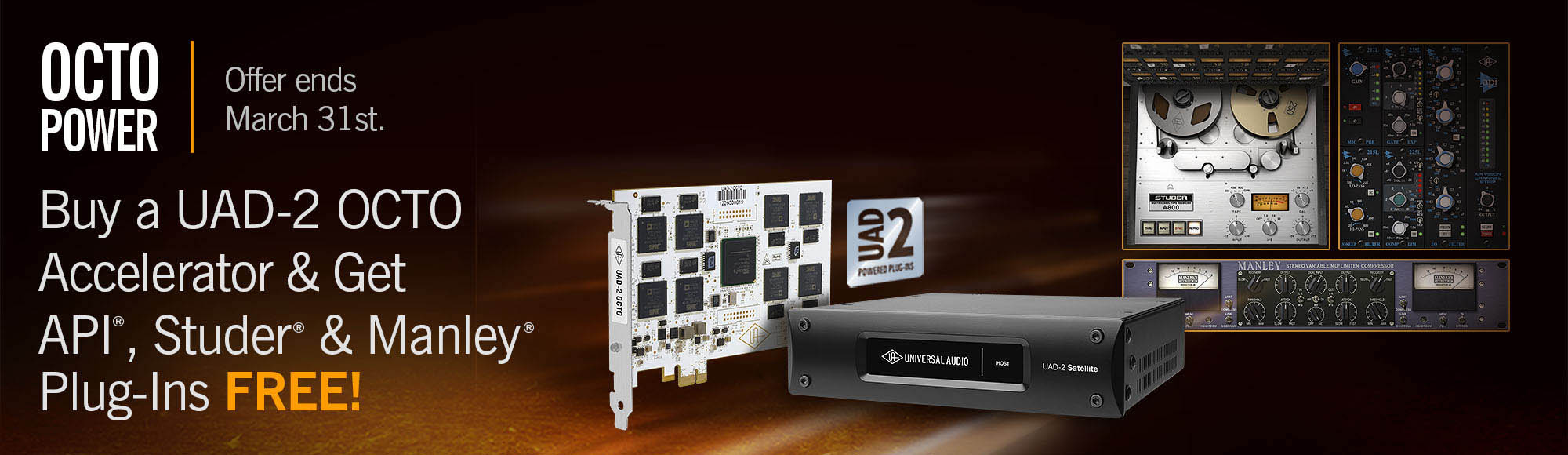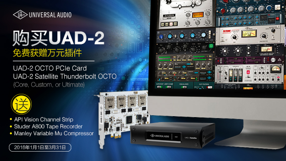 2016年1月1日至3月31日,凡由DMT授权经销商渠道购买UAD-2 OCTO PCIe Card 或 UAD-2 Satellite Thunderbolt OCTO (Core, Custom, or Ultimate)