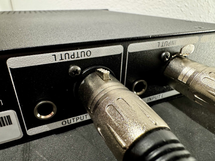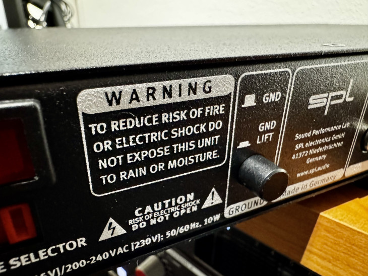 在机身背面,设有输入与输出接口,分别提供 XLR 与 TRS 格式,标识清晰明确。值得称赞的是,这些标识还额外提供了倒置印刷版本——这样在从上方进行布线时,也能立即辨认接口信息。仅凭这一点,我就想为 SPL 的工程师与产品设计师点赞。不仅作为评测作者,很多用户在机架空间有限的情况下都需要在狭小环境中完成接线,有时还要反向思考接口方向。有了这样的标识设计,布线过程明显更加高效便捷。