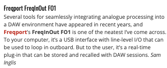 近年来,市场上涌现出多种将模拟处理设备无缝集成到数字音频工作站 (DAW) 环境的工具,而 Freqport 公司的 FreqInOut FO1 无疑是我遇到的最简洁高效的解决方案之一。对电脑而言,它是一个 USB-C 接口的线路电平输入输出设备,可用于外接硬件设备的信号环路;但对用户而言,它是一个可在 DAW 中存储和调用的实时插件,彻底改变了我们使用模拟硬件的工作流程。