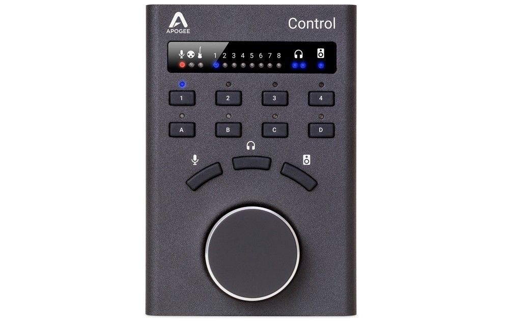 尽管已经有了非常优秀的远程控制软件 —— ElementControl,但 Apogee 还是一款控制器 Apogee Control。Apogee Control 支持 Apogee Element 和 Symphony I/O Mkll 这两款雷电声卡,有了 Apogee Control 你就可以直接在控制器上用大旋钮和 3 个切换按钮调整输入和输出额音量,另外还有 8 个自定义快捷功能按钮。