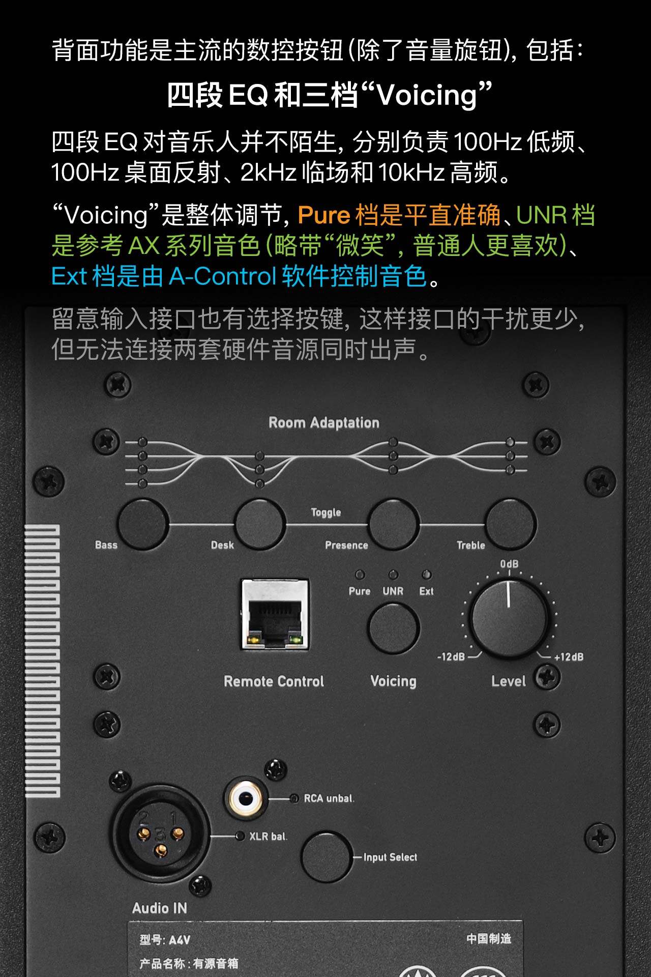 A4V 和 A7V 是共享 90W 功放模块的,加上超大箱体的加持,因此 A4V 的下潜也比 SC205 和真力 8320 起码深 10Hz.. 达到 5”寸监听的水准。其实上一代 A3X (4.0”寸) 官方数据只有 60Hz/-10dB,A4V 相当于“加一寸”。