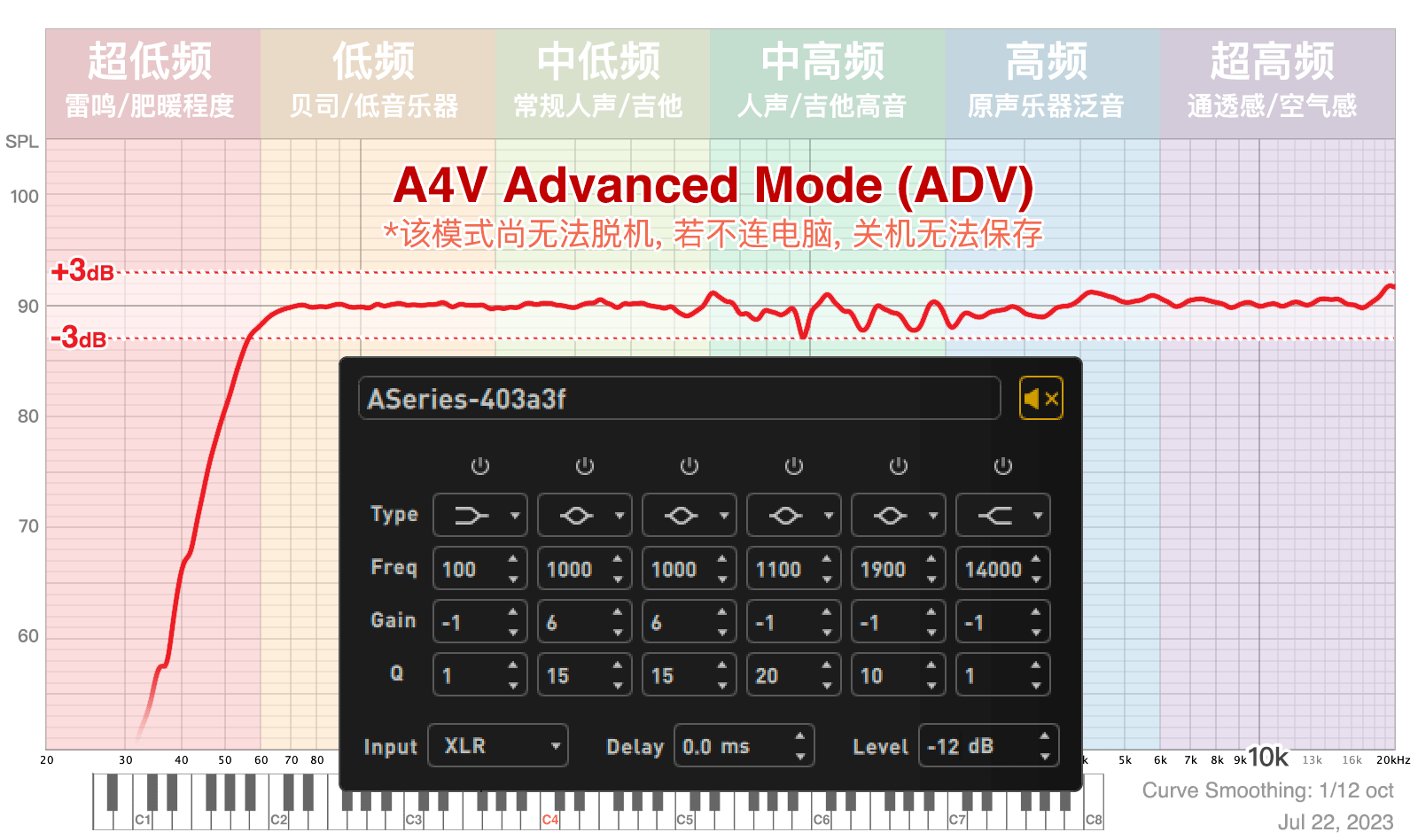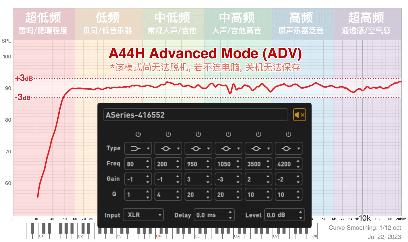 这也不是没代价——由于用了两个 6dB (最大幅度) 来弥补 1kHz,所以总音量要衰减 12dB (避免增加底噪),另外目前 ADV 模式不能保存,脱离电脑 (拔网线) 后重新打开音箱,即使音箱小灯处于【Ext】模式,但声音测出来还是 Pure 模式,不知道日后的固件能不能解决。
