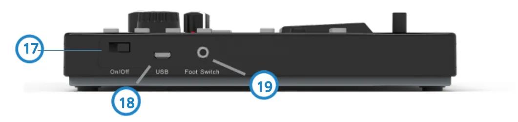 12. 音量旋钮: 配备LED显示灯,默认发送CC#7信息。配合工作站整合,指示灯可显示工作状态。