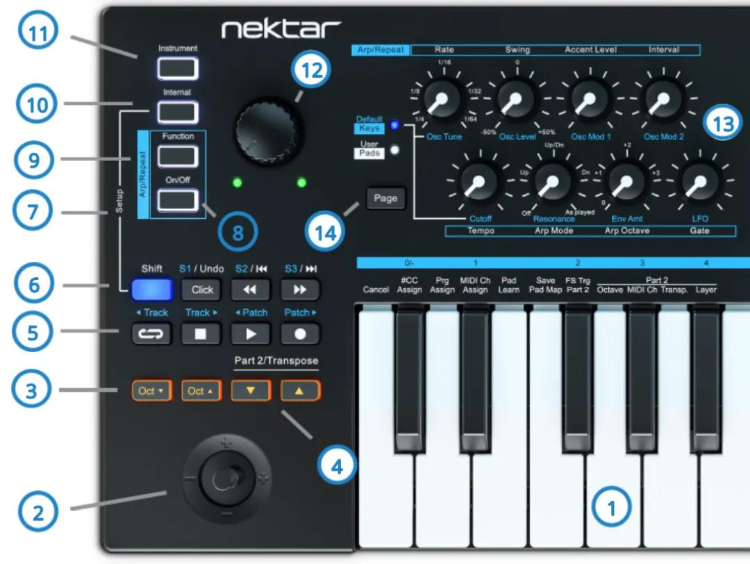 8. Arp/Repeat [On/Off]: 开启或关闭琶音器和复奏功能。LED闪烁表示当前曲速。