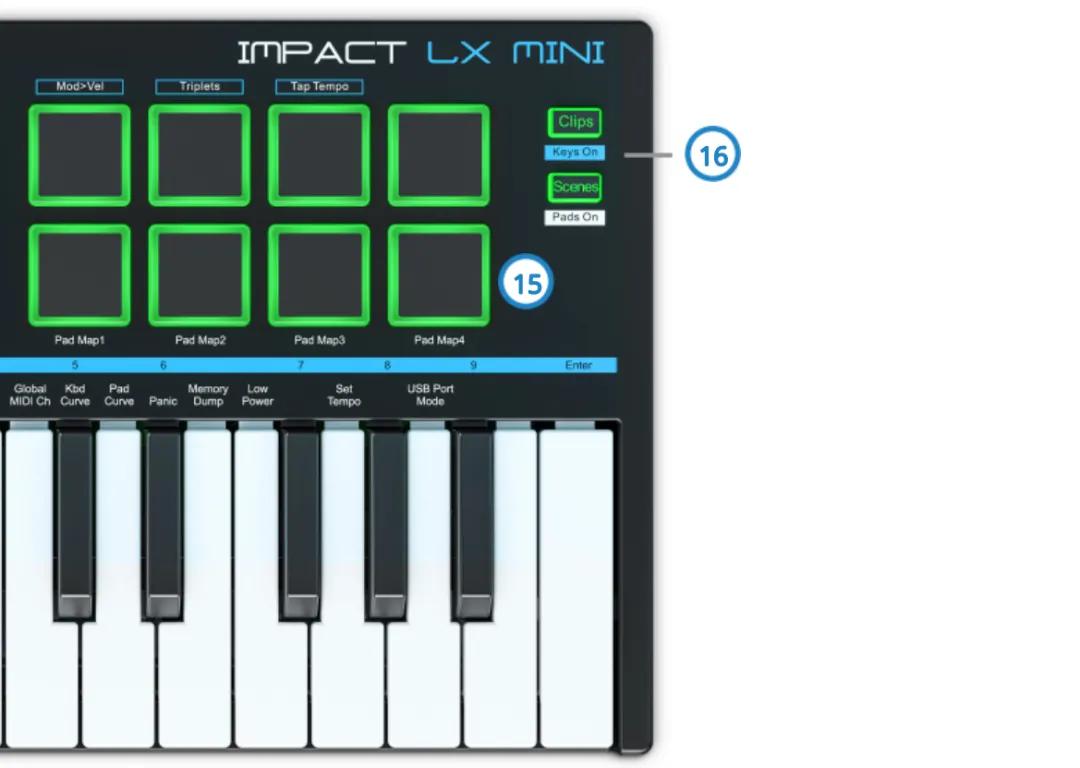 15. 打击垫:8彩色LED打击垫。可自定义MIDI音符,CC和Program信息。