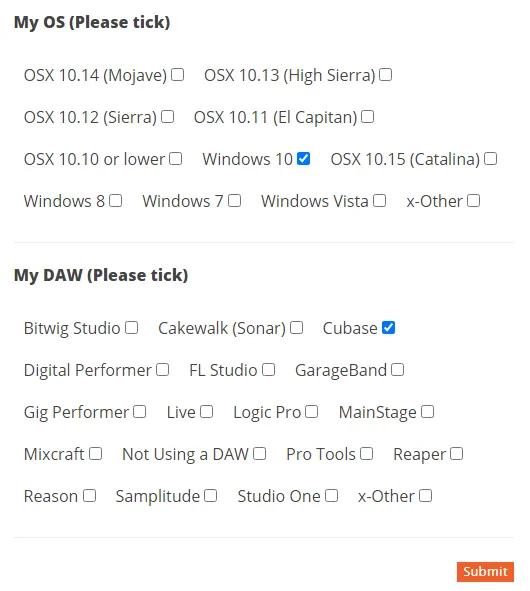 8,请勾选您所用的电脑系统和音频工作站。(下图勾选仅为示例,请按实际情况选择)勾选完成后,点击Submit按钮。然后,您的产品区会显示出相应的软件资源,包括工作站整合程序,固件更新文件等等。