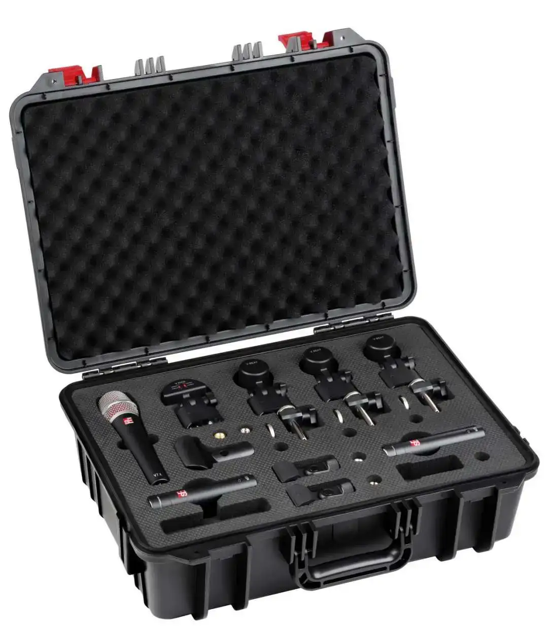 The V PACK ARENA 套装包含:1 支 V KICK 用于底鼓,3 支 V BEAT 和 3 个 V CLAMP 用于通鼓,1 支 V7 X 用于军鼓,外加一对 sE8 电容麦克风作为overheads。