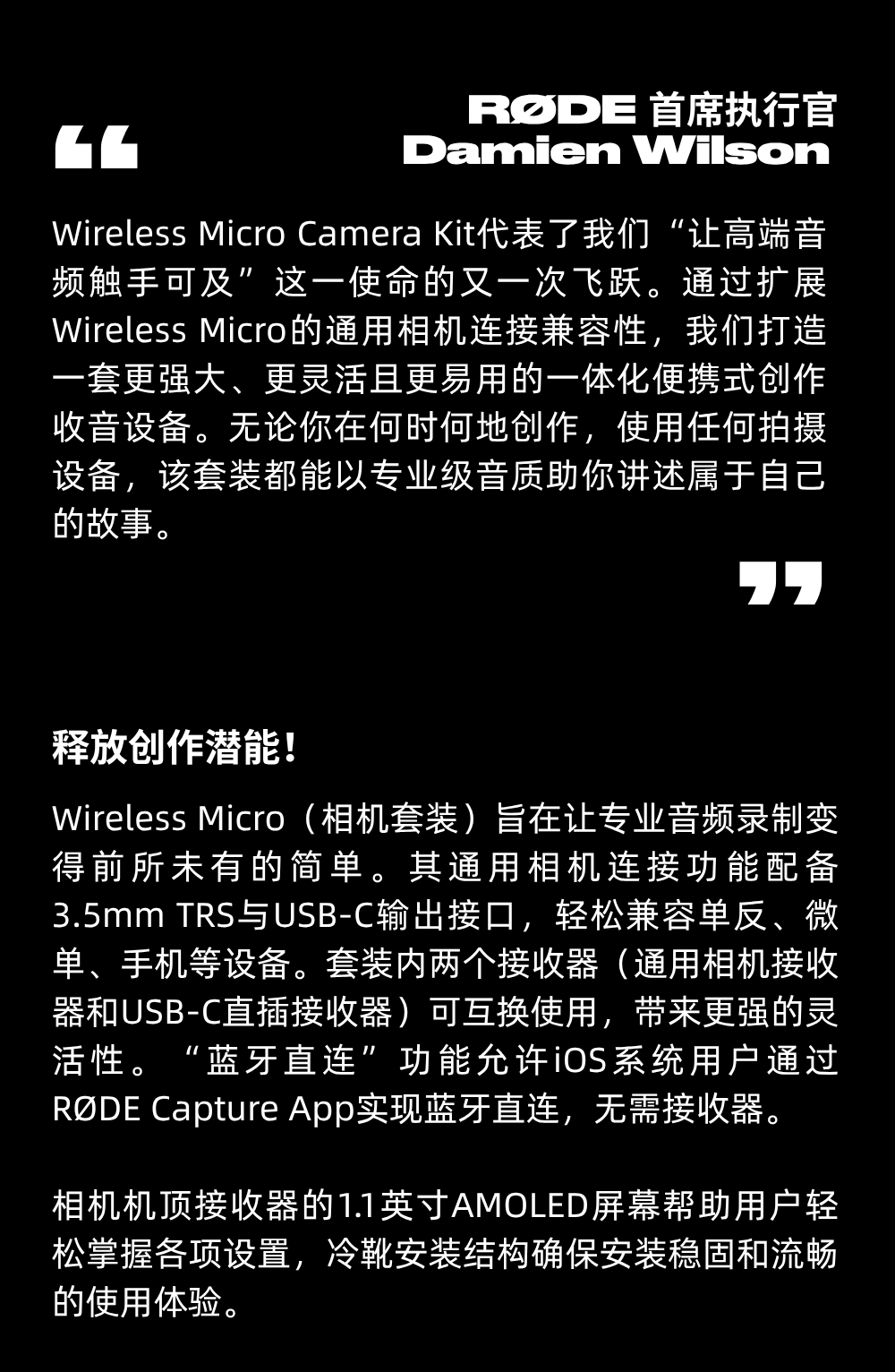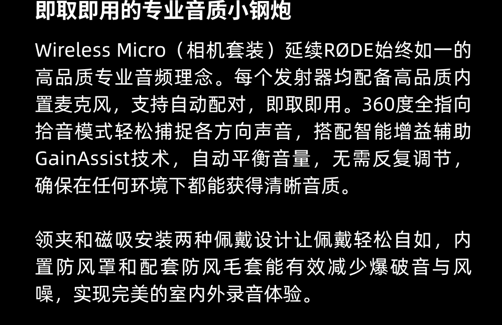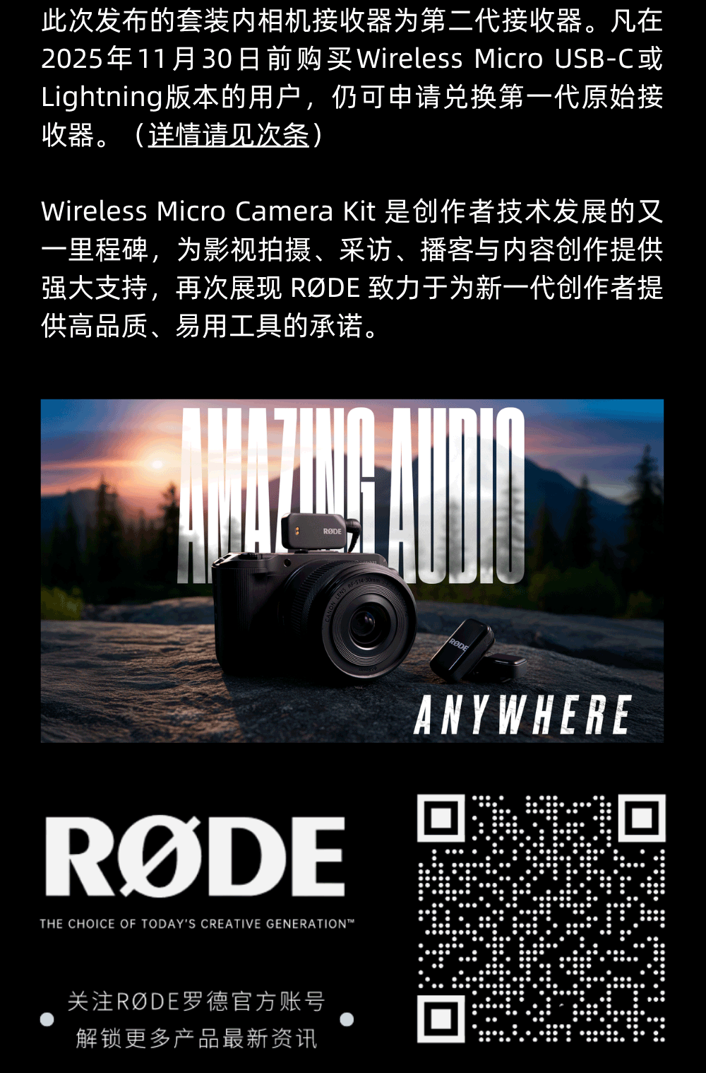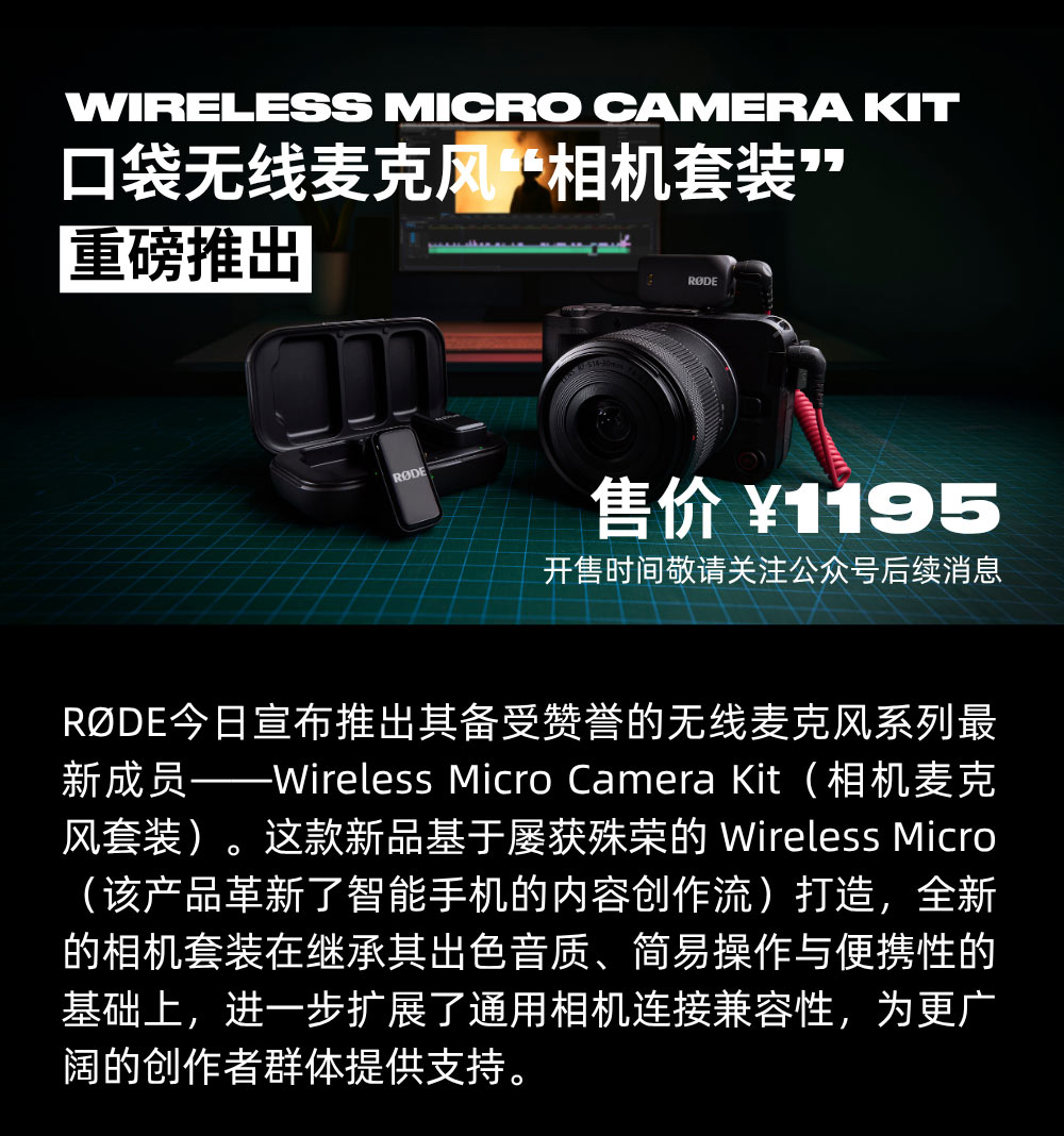 重磅推出 | 口袋无线麦克风“相机套装” Wireless Micro Camera Kit微博微信2025.10.30 / 阅读:80作者: 叉烧日爆RODE 今日宣布推出其备受赞誉的无线麦克风系列的最新成员——Wireless Micro Camera Kit相机麦克风套装