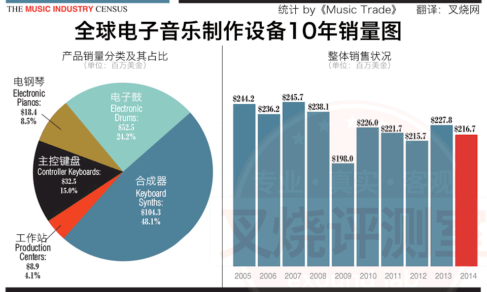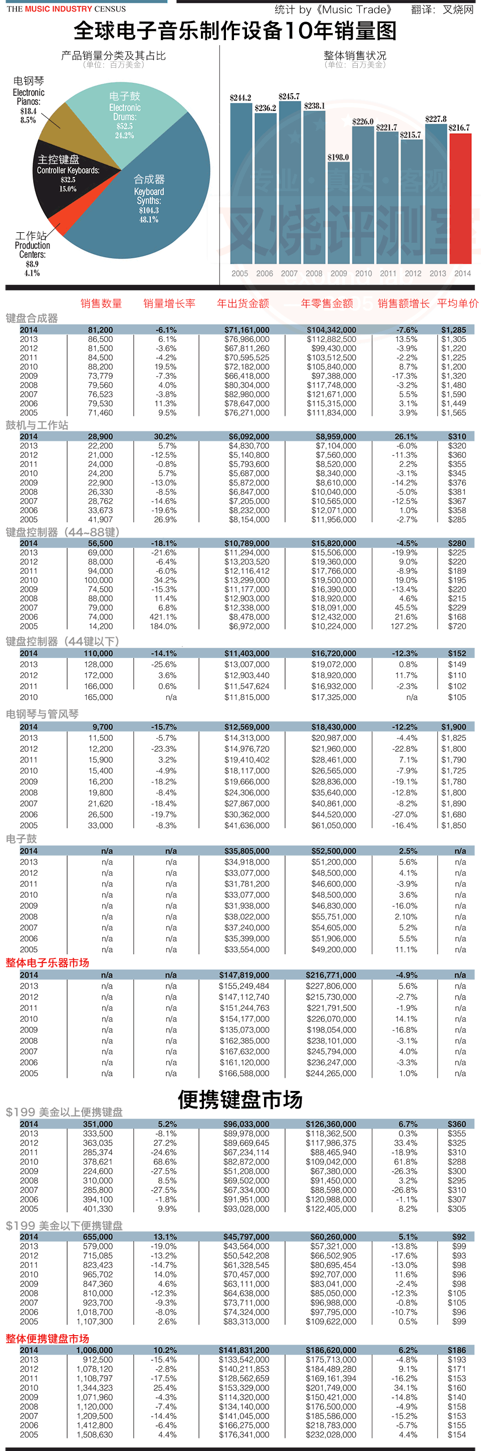 根据《Music Trade》的统计,MIDI 键盘(Keyboard Controller,键盘控制器)曾在2006年实现了难以置信的 421% 销售数量(74000台)的增长,不过现在它连续多年下降,2014年44键以上销售数量是56500台,还不及 2006年。