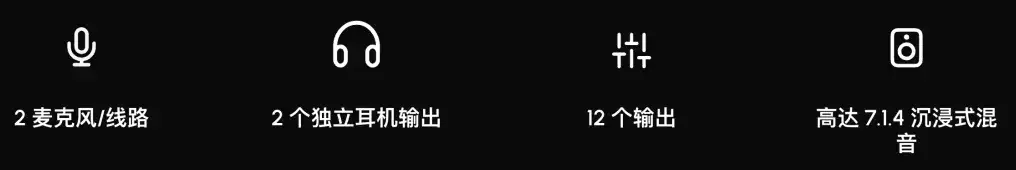 强大的 9.1.6 Atmos 混音接口,具备 8 个麦克风/线路输入和 16 个线路输出,同样适用于传统的录音和混音工作流。