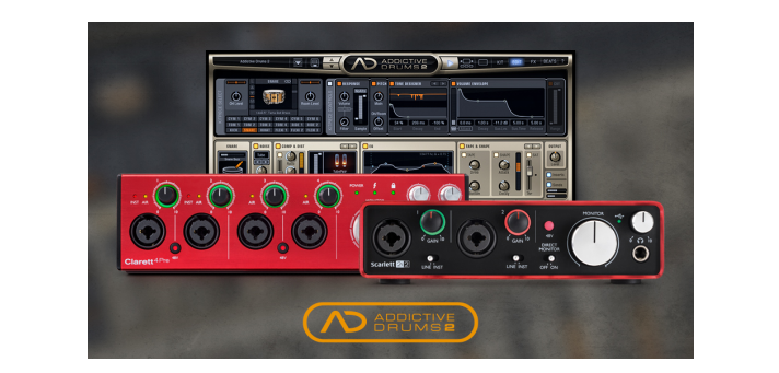 2017年11月20日至2018年1月31日期间购买并完成产品注册的Scarlett(2代)和Clarett系列音频接口用户,可以免费获取XLN Audio公司的Addictive Drums 2 鼓组制作工作站。用户将得到全套的Addivtive Druns 2引擎,并且可以选用任意的 AD Pak,MIDI Pak和Kitpiece Pak。AD Pak,MIDI Pak和Kitpiece Pak是提供给Addictive Drums 2用户的扩展产品。只需要简单选择好你所需要的音色,然后运行在线安装程序,即可免费使用额外的音色了!