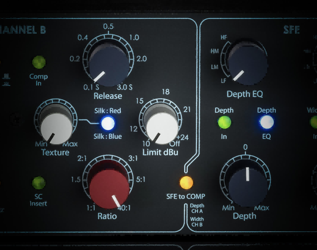这个发光的按钮开关用于控制各自通道上的压缩器/限幅器部分。启用或禁用“Comp In”按钮不会影响SILK工作状态,也不会影响SFE工作状态,除非启用SFE to COMP。