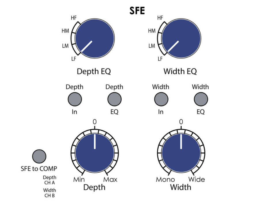 这个发光的按钮开关与4步进旋转开关组合使用,允许用户在四种不同的EQ设置之间进行选择以进行宽度处理:低频 (LF)、中低 (LM)、中高 (HM) 和高频率 (HF)。