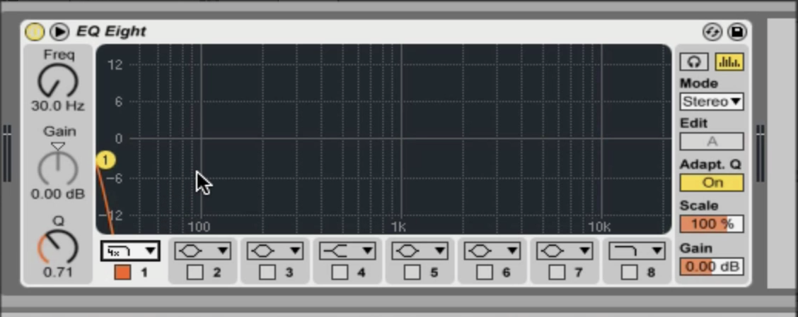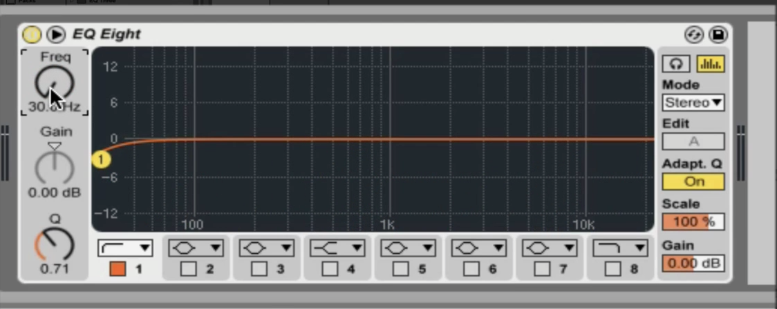 2.在 A 轨道的 EQ8 中关闭所有滤波,只打开 HP Filter(高通滤波)
