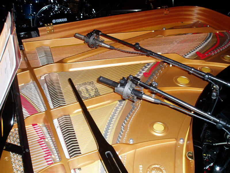 这是一种记录古典钢琴的极好技巧。将一个Royer SF-24铝带麦克风放在钢琴的开盖外面,麦克风前倾朝向音板。