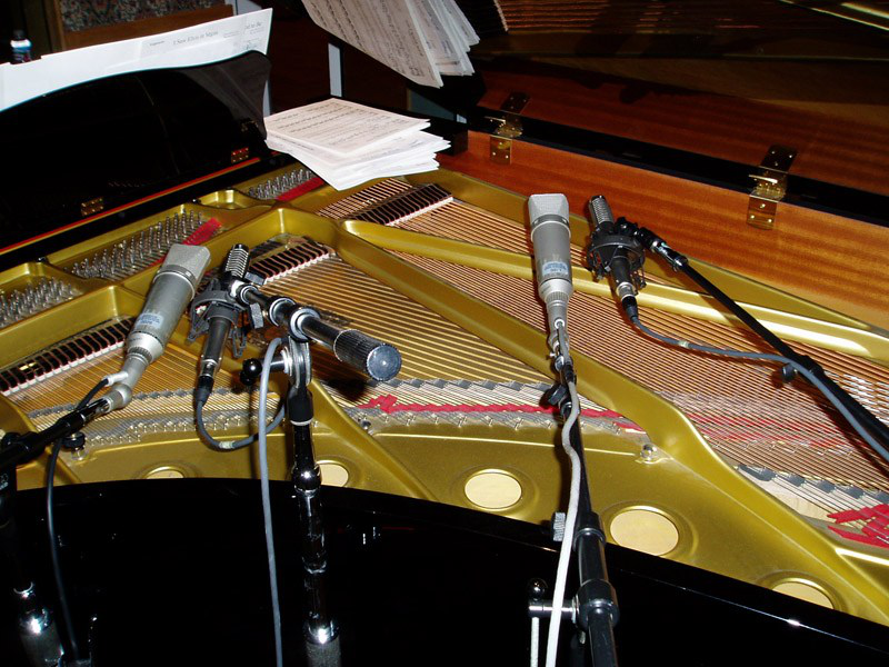 钢琴的录制方式多种多样,不同的拾音方式产生的效果也有明显的不同。古典音乐的录音通常得益于一定程度的室内氛围,通过把麦克风放在钢琴的外面或与钢琴保持一定的距离来实现。流行和摇滚唱片通常要求钢琴的音板发出更近距离的拾音,以便做出更紧密、更直接的反应。去掉钢琴盖子可以在反射情况下对音板进行拾音,而在完全开盖的情况下,在盖子外面放上麦克风可以让录音更丰满、更自然。钢琴是一种非常复杂的乐器,记录它的可能性是无限的!