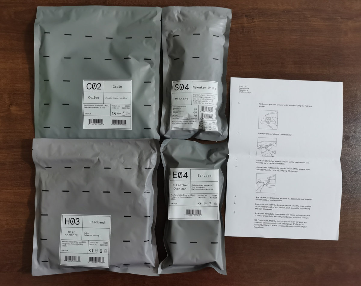 从里面我们拿出四个模块:H03耳带、S04扬声器单元、E04包耳皮质耳罩、C02音频线、以及和一张使用说明,每个模块都是密封包装。