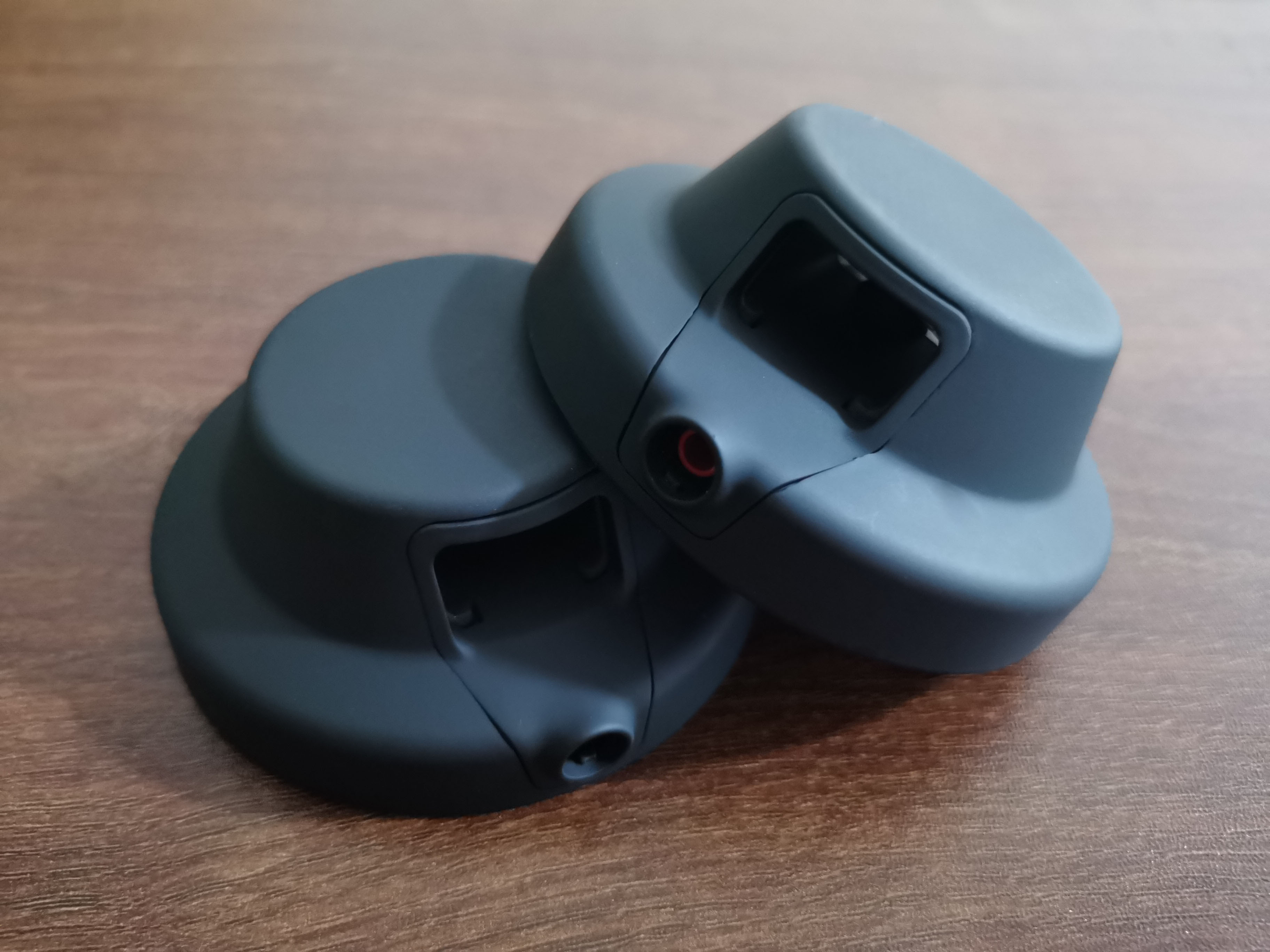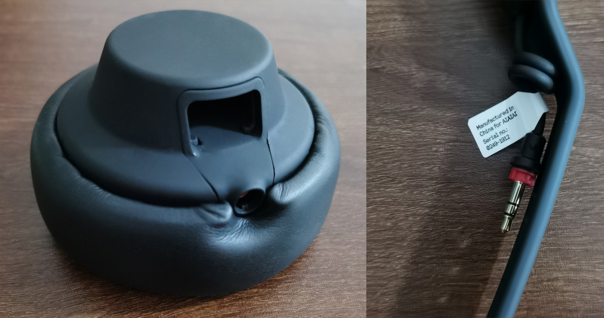 首先,我们找到带有红色插头的扬声器单元,这是适用于右耳的,将它和一个耳罩合并即可。
