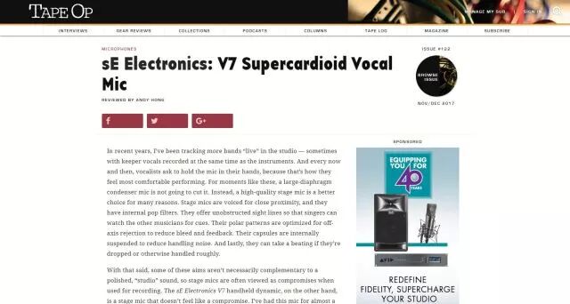 美国专业录音杂志《Tape Op》在122期(2017年11/12月刊)中发表sE V7评测,评测人Andy Hong综合整理了 V7的各项性能,并与Shure Beta 58A进行对比,他说: