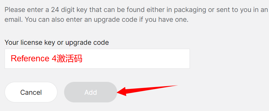 4,在输入栏填入Reference 4激活码,然后点击‘Add’