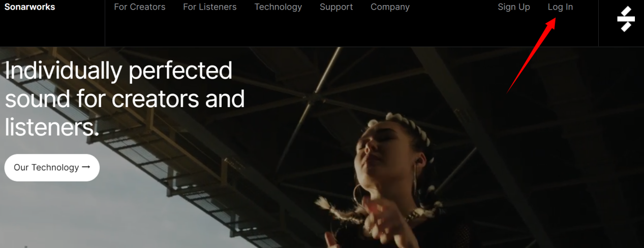 1,如果您具有Sonarworks账号,请首先在Sonarworks官网登录您的账号:访问https://www.sonarworks.com/,点击右上角‘Log In’。(如果您没有Sonarworks账号,请先完成前文注册账号部分的操作再进行下一步)