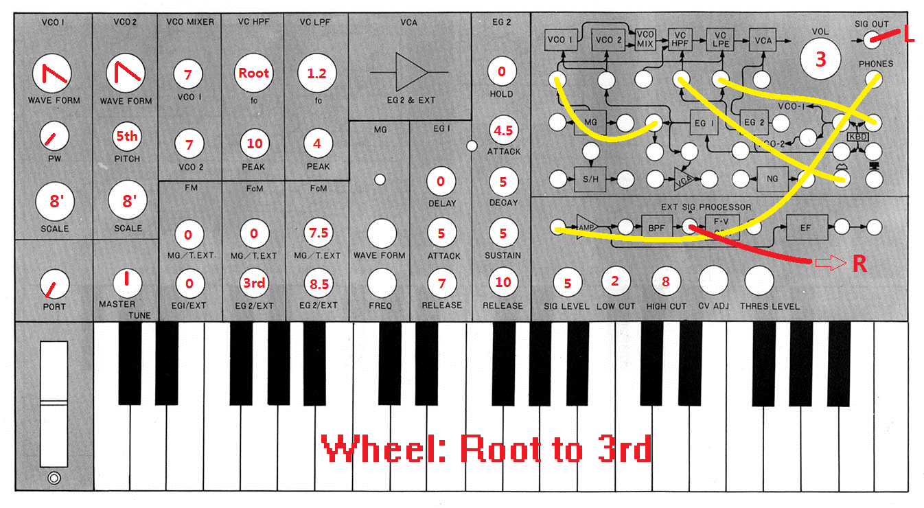 这样滚轮就代替2号包络去控制HPF的频点了。由于滤波器自振的音高就是Cutoff的频点,那么调整HPF对应的EG2/EXT,使滚轮滑到顶点时,HPF的自振音符为根音的小三度(或大三度,如果你弹大调的话)。最好也对比着1号振荡器的小三度音进行调整,从而让共振的音高准确。