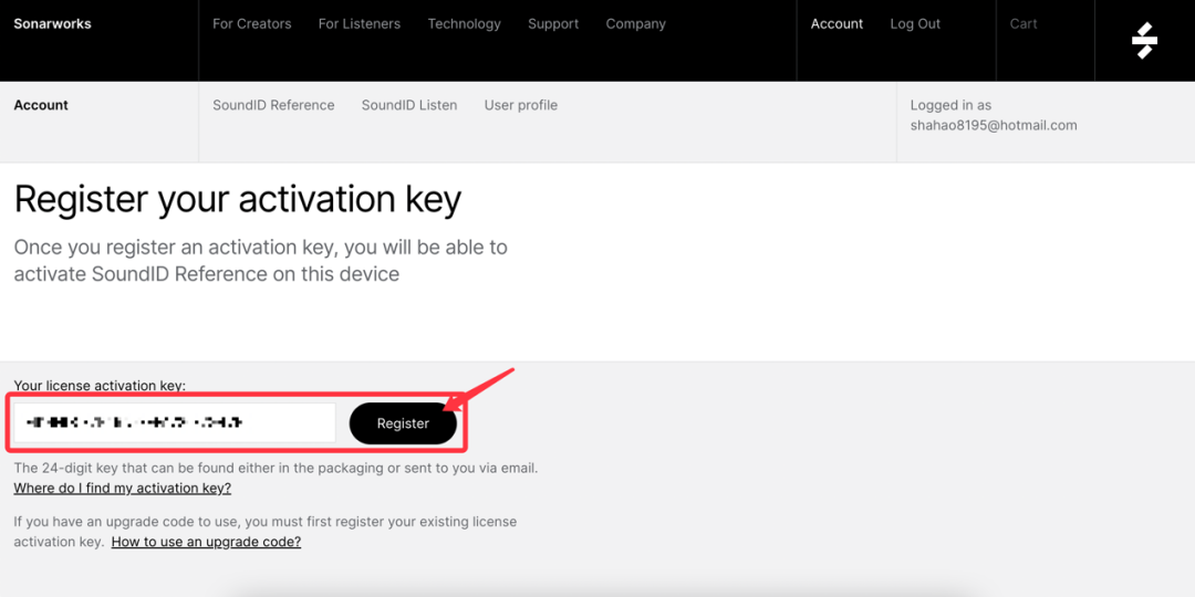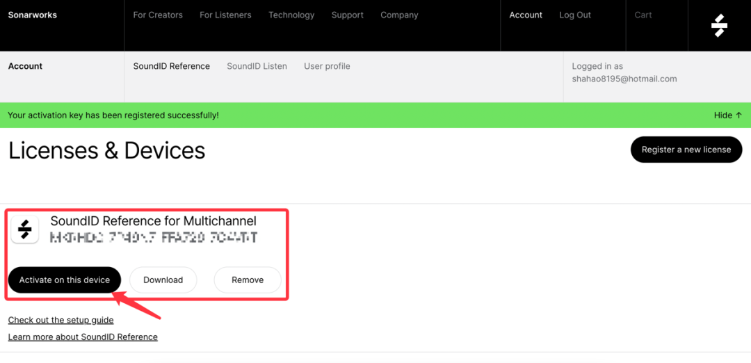 登录后会进入你的Sonarworks个人主页,点击上图右上角红框所示Register a new license按钮,注册你的SoundID多通道版本软件序列号。