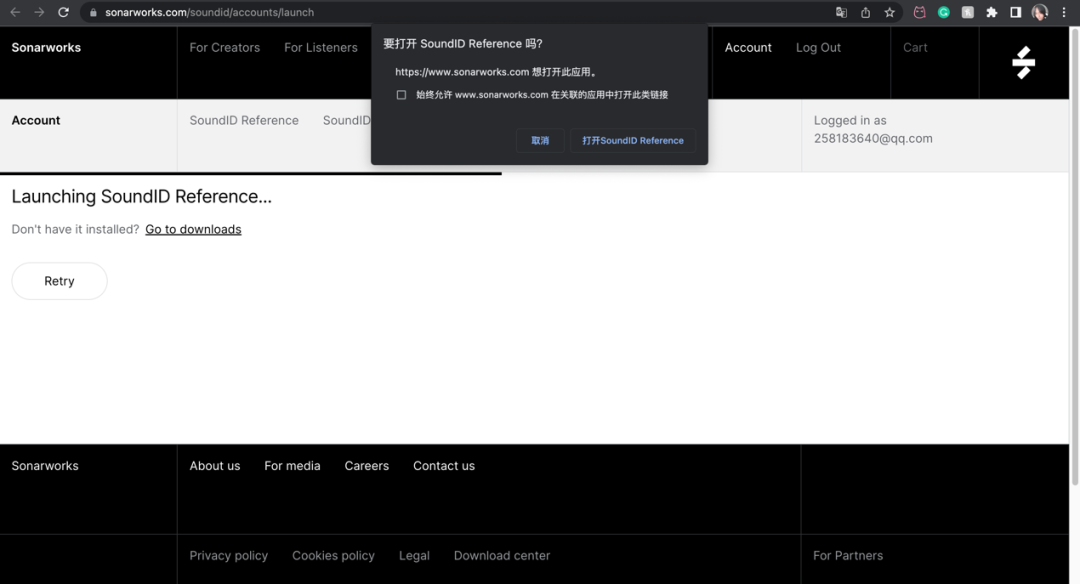 之后网页会自动跳转到Sonarworks网站,并弹出提示打开SoundID应用程序完成账号自动登录。点击打开SoundID Reference。