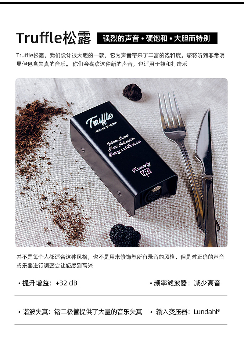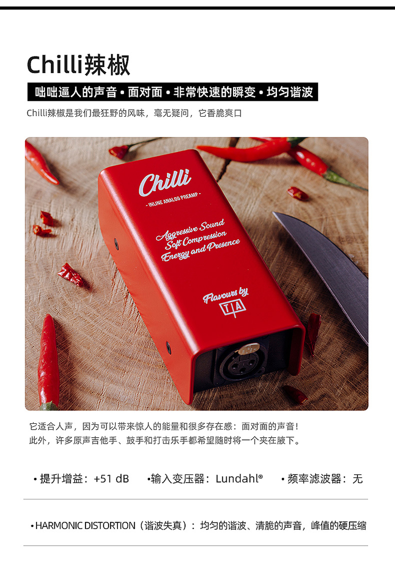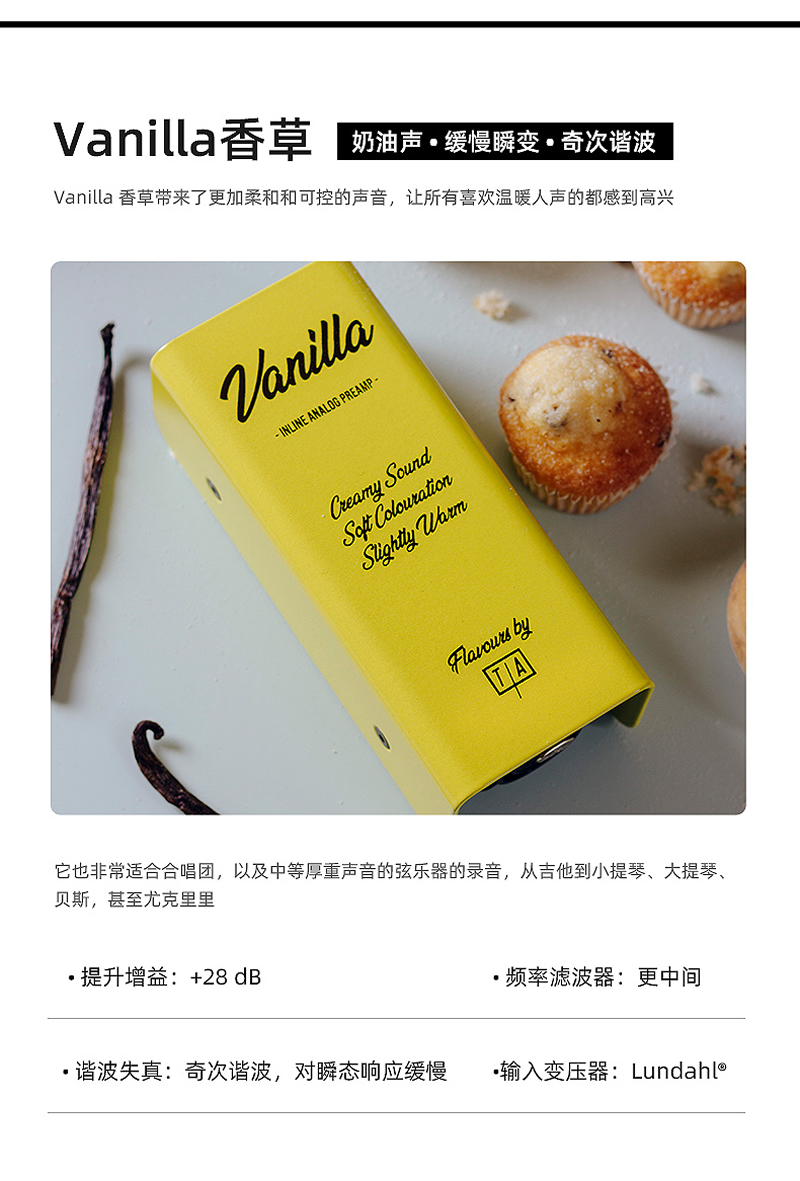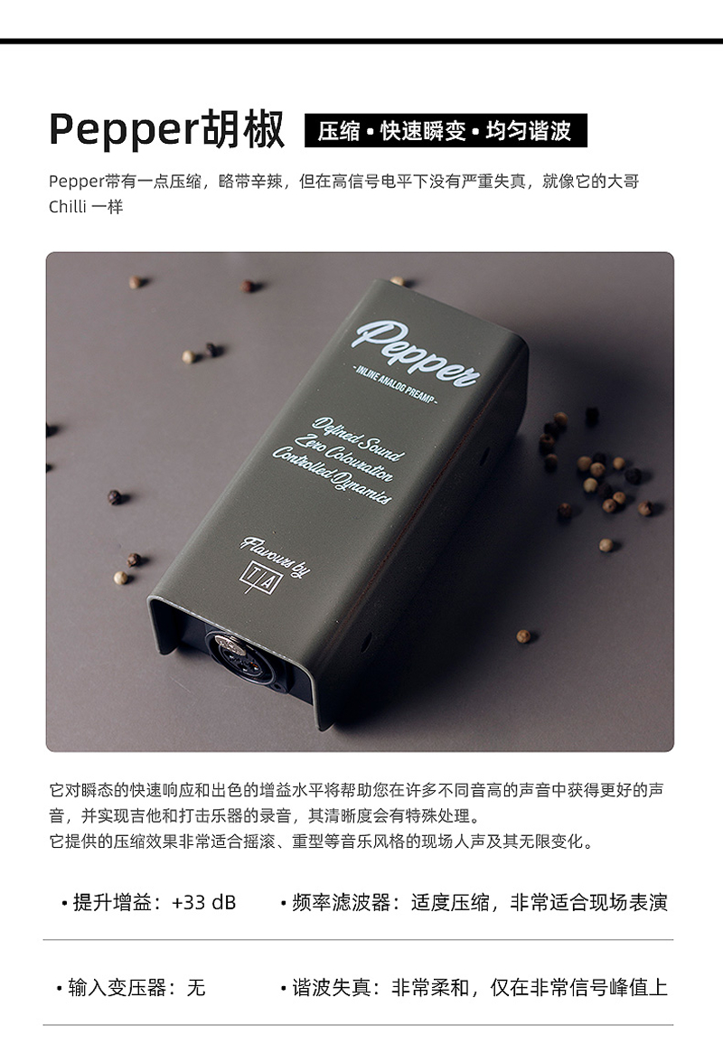 我们设计的七种不同的(Truffle松露, Cocoa可可, Mint薄荷, Chilli辣椒, Vanilla香草, Pepper胡椒 and Salt盐)信号放大器,它们各具不同风格和声音,适合于不同的类型需求。每一个都拥有不同的增益水平,专为带来个性化,始终不失音乐性。您将获得更温暖的细微差别和声音,如果你需要形容词来形容,它们能带给你锐利的声音,或者更热情,有的更密集,有的更有饱和度。当然,清晰,更多颗粒化,或者脆亮。