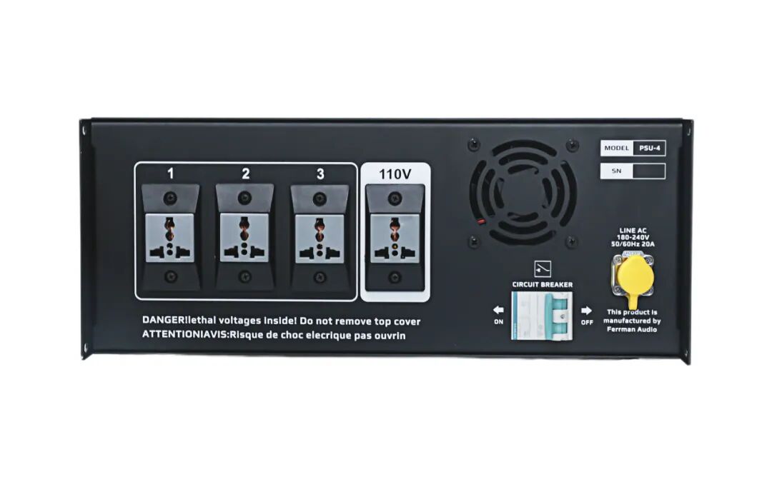 Ferrman PSU-4共有5个电源接口,其中背面板3个220V电源接口带有防浪涌、时序管理和三级医疗级滤波、稳压架构,用以连接专业音频设备如:声卡、监听音箱、模拟硬件、调音台、时序电源等使用。