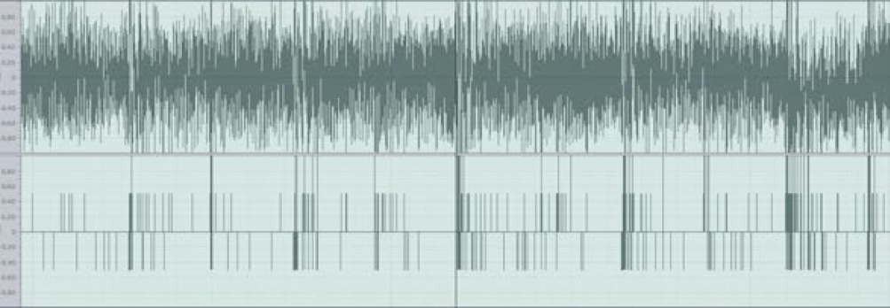 Afclip 会生成一个音频文件;上方的通道用于分析文件,下方用脉冲信号指示削波的位置。