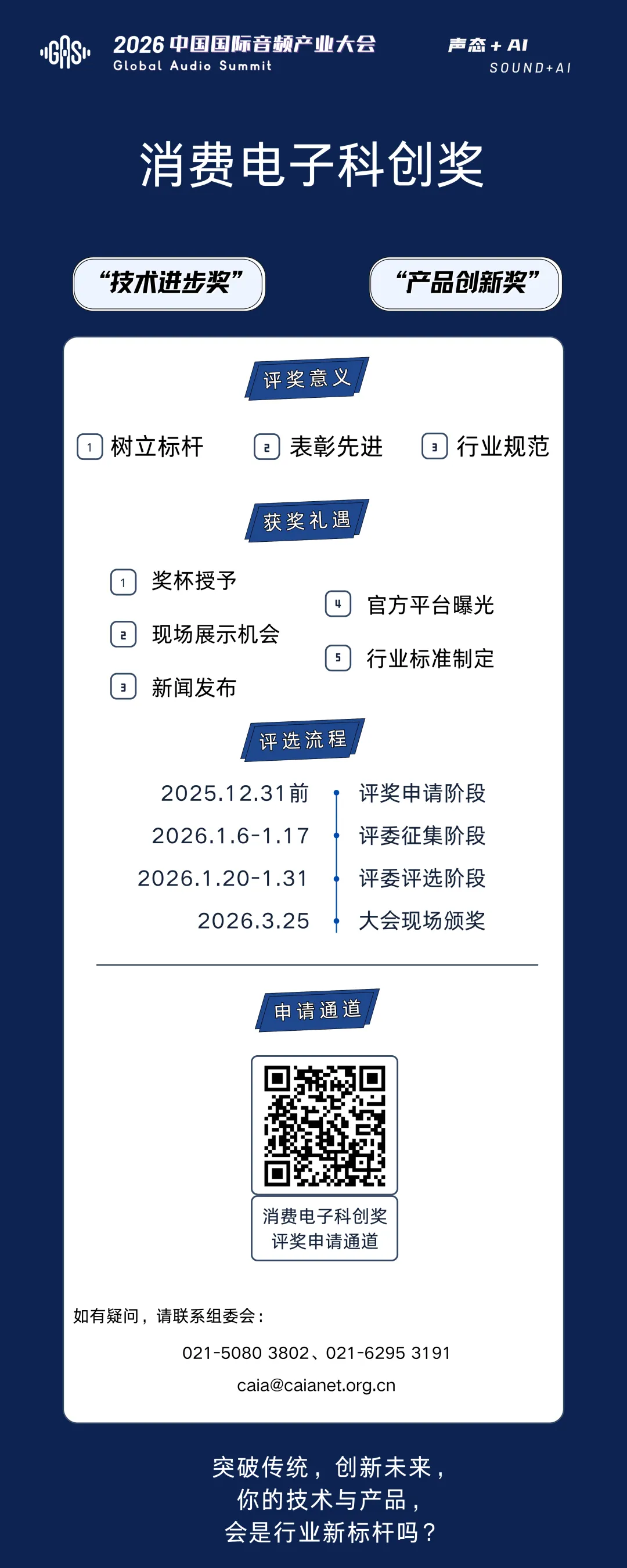 该奖项旨在表彰全球消费电子领域具有突破性贡献的技术与创新产品,推动行业前沿发展。评选将聚焦人工智能音频技术、绿色低碳设计、沉浸式音频体验等方向,由行业专家、科研机构及资深媒体共同评审,确保权威性与公正性。