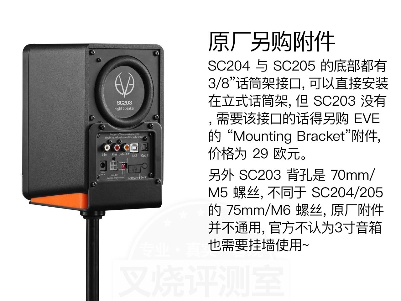 与所有电子产品一样,“监听” 的定义一直在变,2000年 ESI 推出 nEar05,专业厂商都觉得 6寸以下是玩具;今天 4寸监听都快30款了,并覆盖高/中/低端;而 3寸监听——去年对我来说还是“玩具”,今年已近20款,并且出现了两款比入门 8寸监听还贵的 “高端” 3寸监听,说明市场的需求不低,上月我们试玩了 Genelec 8010A,今天我们收到了另一款:EVE SC203。