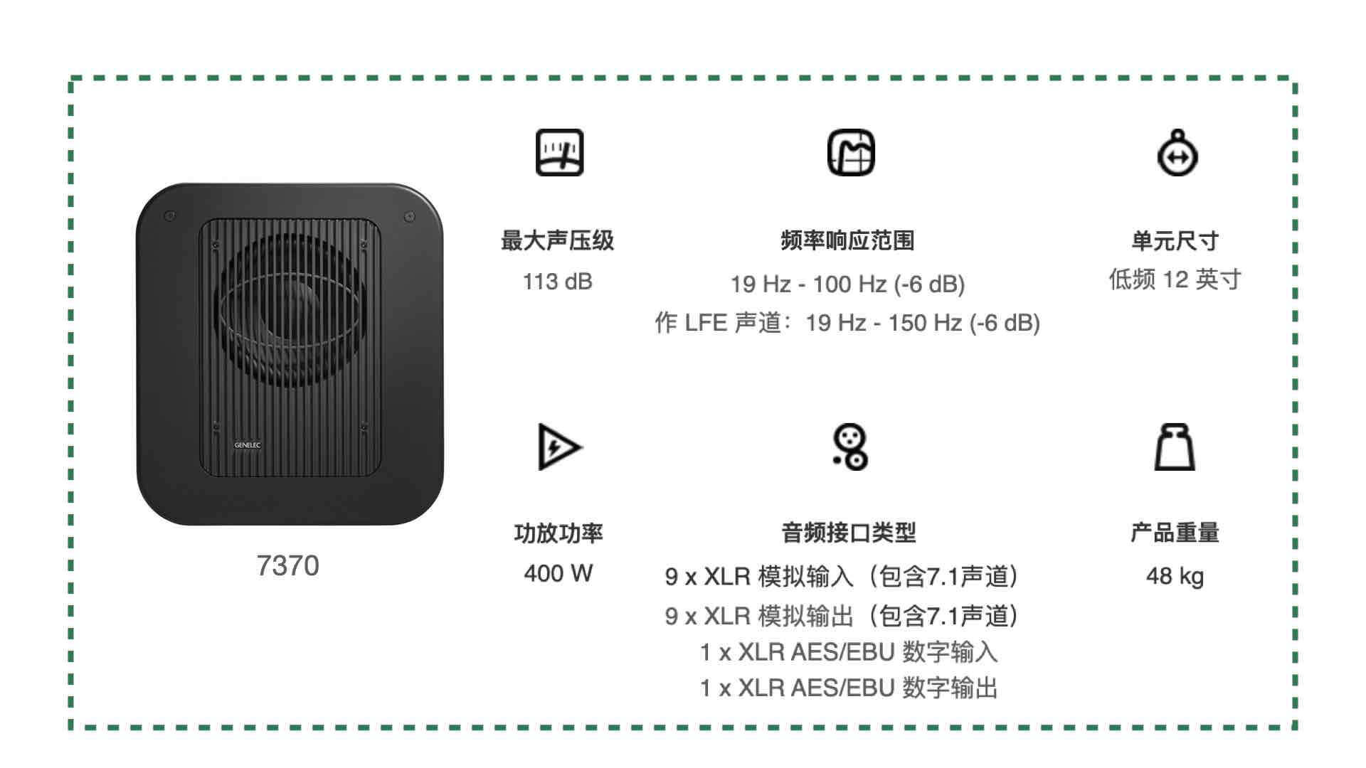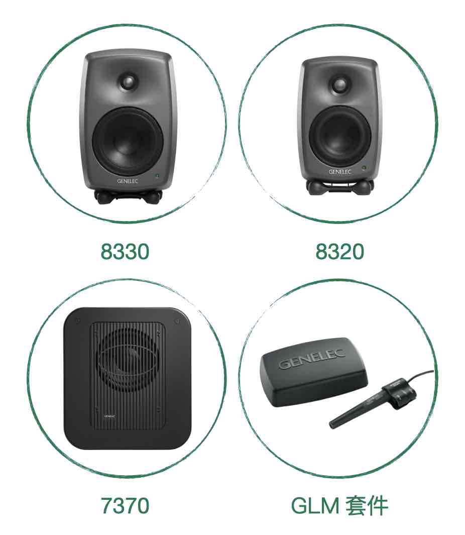 除了顶部音箱选择 8320 之外,前方的左、中、右音箱孙屹选择了稍大一个尺寸的 8330, 4 只环绕音箱选择了和顶部相同的 8320,再加上 1 只 7370 超低音箱,负责 LFE 声道的同时,也给水平 7 只音箱做低频管理。