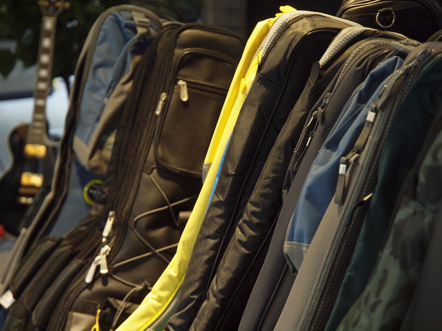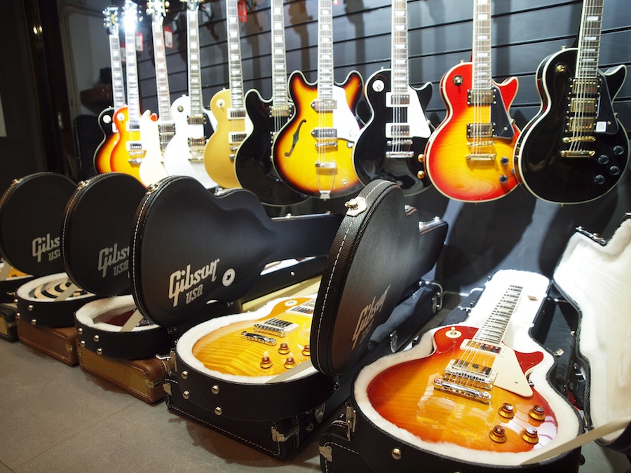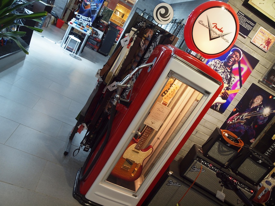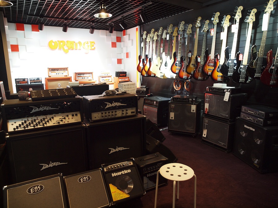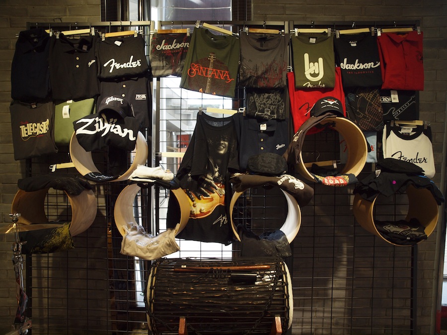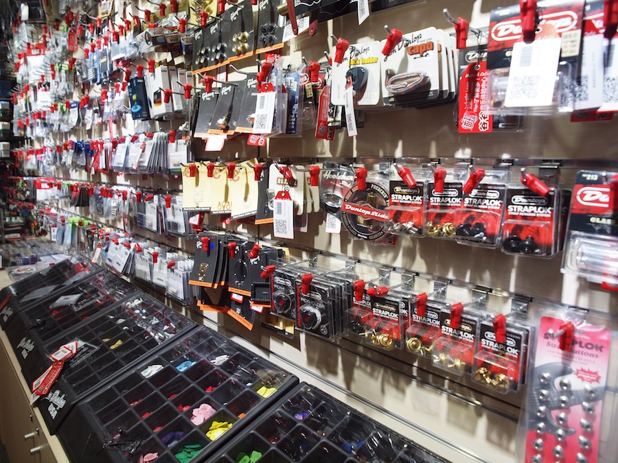 进门右手边是打击乐区,左手边则是吉他区,琴包、琴箱、配件都很丰富,还有很多手办和迷你小设备。