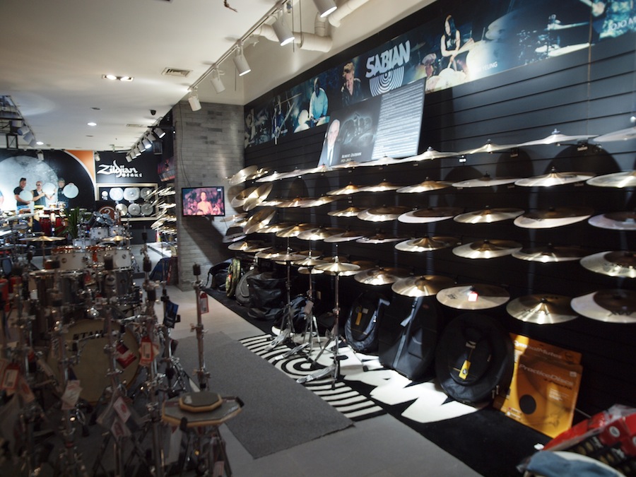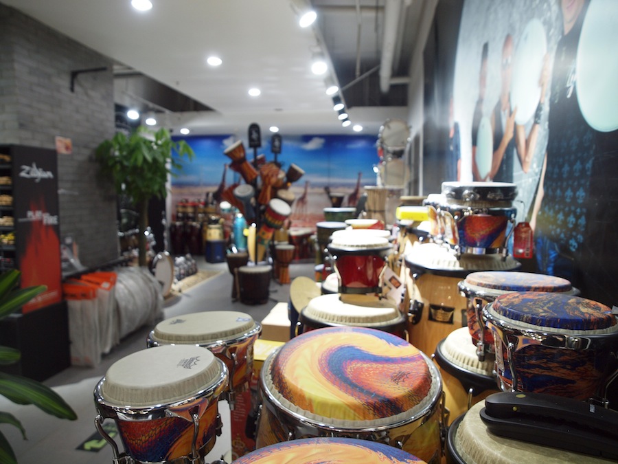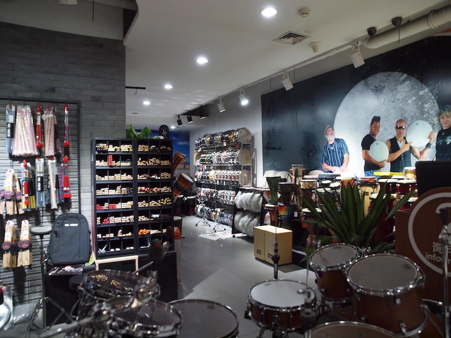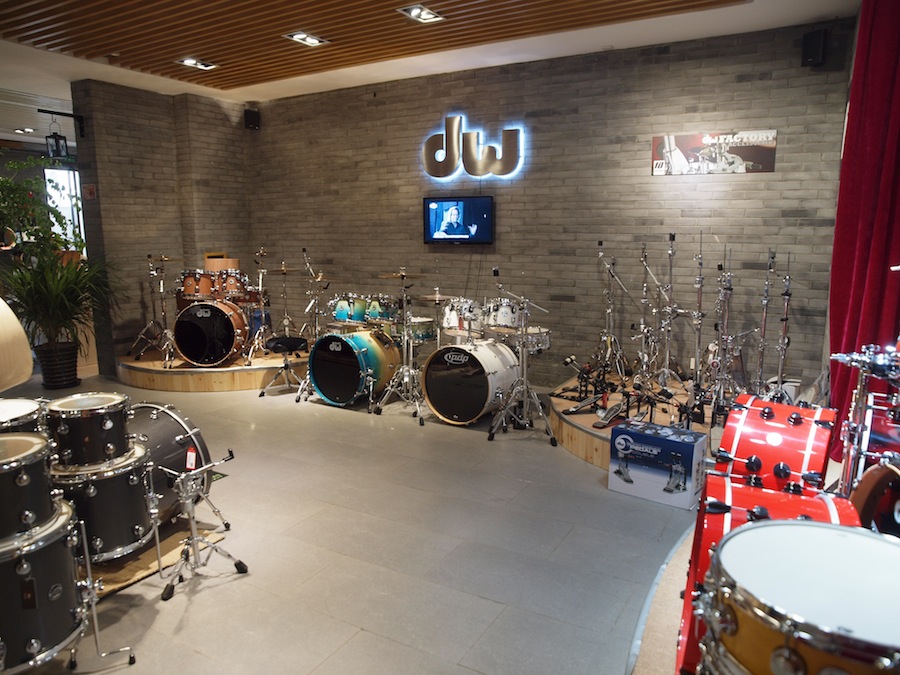 鼓手进门后请往右走,体验中心目前介绍有20个品牌入驻,乍一看好像不多,但全是知名的大品牌,每个品牌有很大的体验区,品牌的型号齐全,下图分别是珍珠鼓、SABIAN、DW、REMO、知音(最新的数字擦片)...