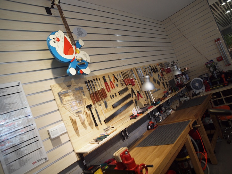 前台的左边,是一个让理工男(例如我..)无法自拔的专业吉他维修区,一大堆没见过的好玩工具...据说将邀请知名维修大师来做讲座(MM看后表示要我送她一把哆啦A梦吉他..)。