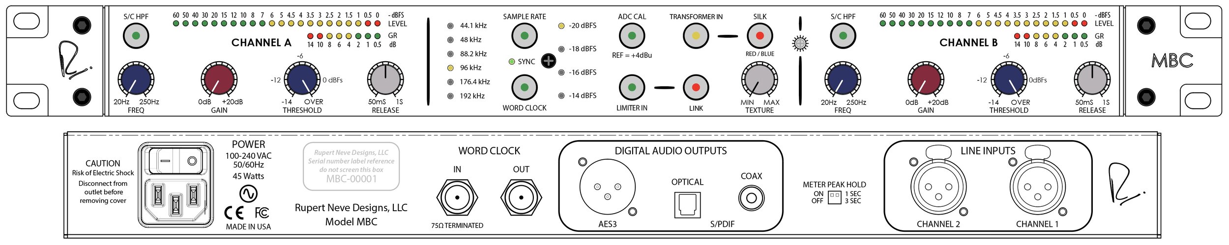 Master Buss Converter(下称MBC),为数不多的Rupert Neve Designs(下称RND)家族的数字类型产品。作为一款双通道(立体声)A/D(模数)转换和限制器,MBC是用于创建具有尼夫代表性音质的终极利器。