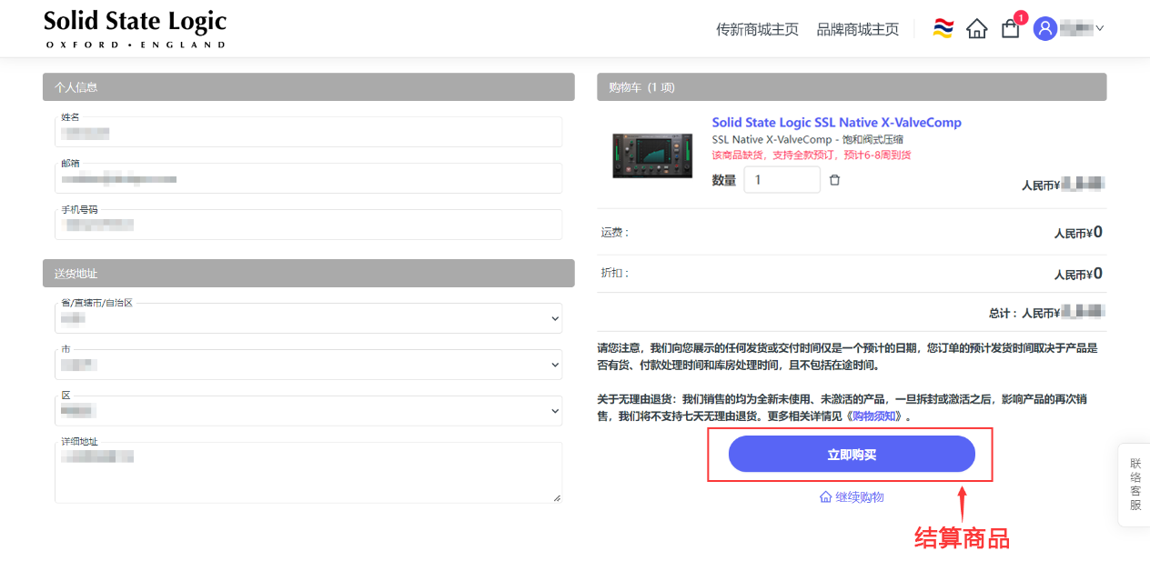 如果在上述过程中遇到问题及需要咨询,请点击在商城页面右侧的 “联络客服” 帮助您解决。