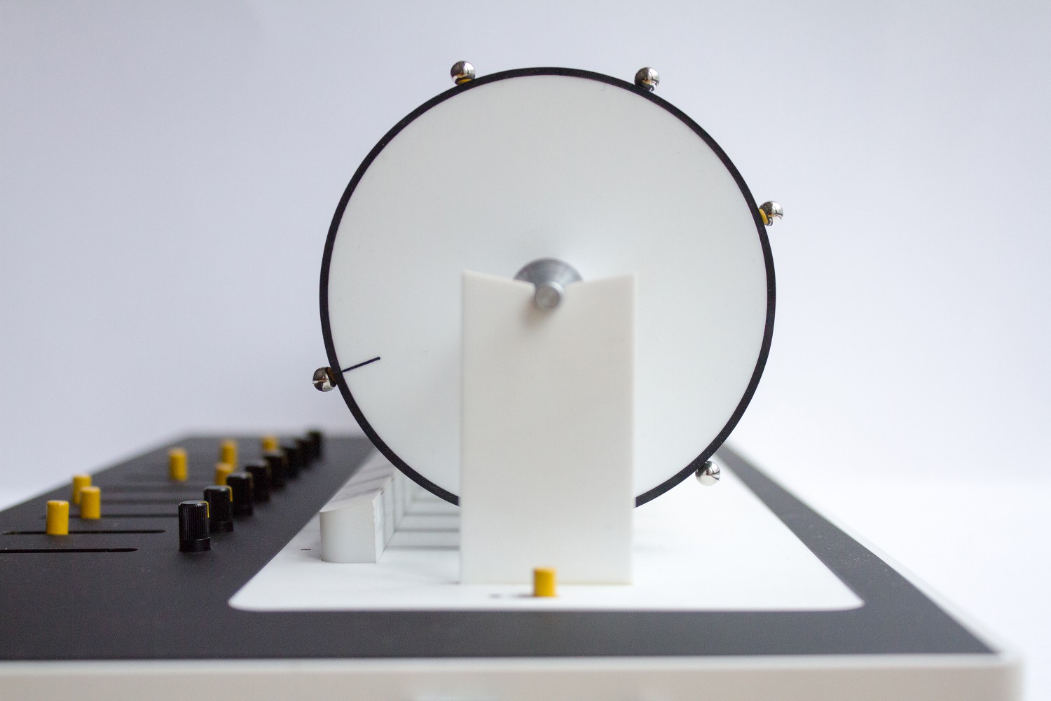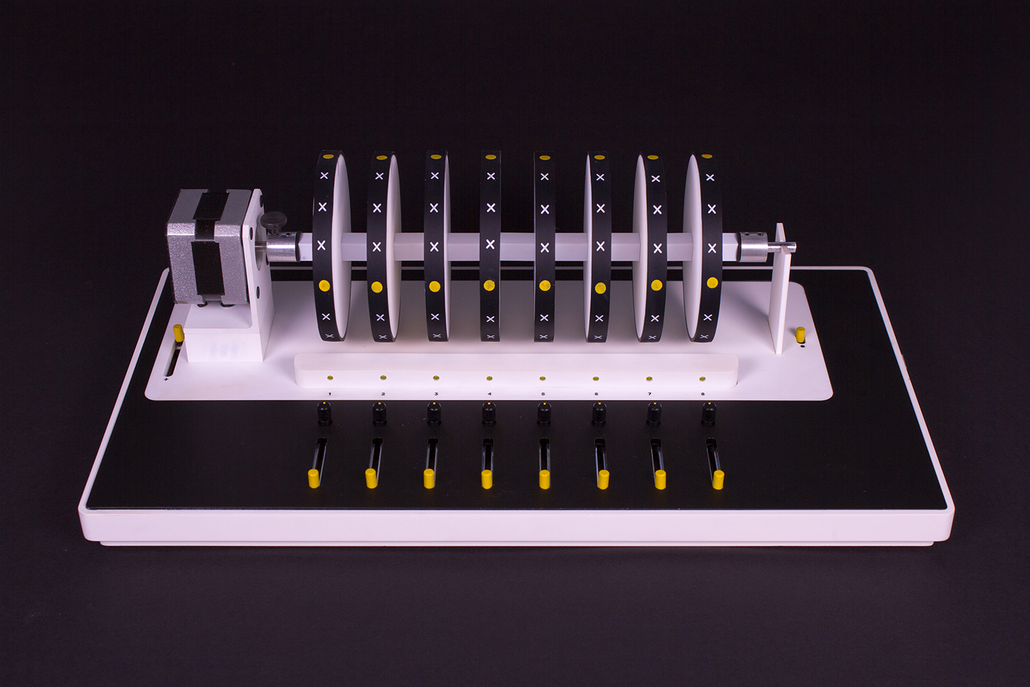 这款 MIDI 音序器的运作方式小编从来没有见过,除了控制器音量的旋钮和推子外,这个控制器的主体竟然是 8 个磁性转盘。当进入播放模式后,这 8 个转盘就会开始转动,表示循环播放,用户需要把小磁铁放在转盘上来输入音序器符号。说着说着,小编感觉一下子回到了童年…….
